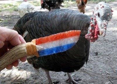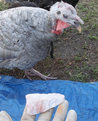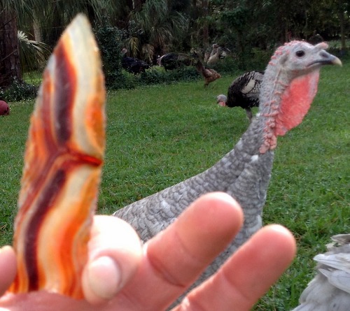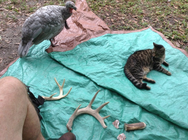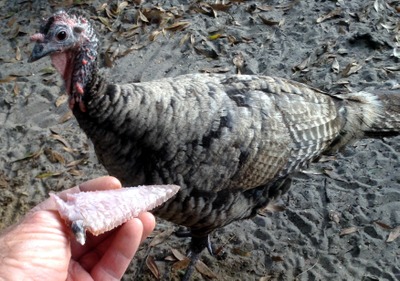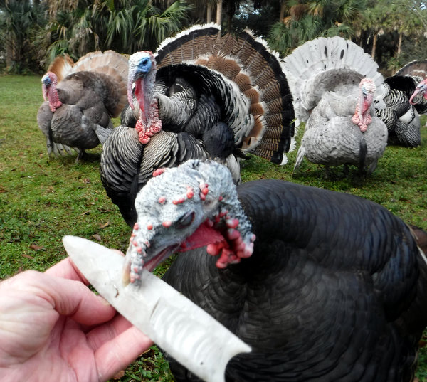 Spanish Black turkey-also called a Norfolk Black (We call him Inky) and a branch I picked up that resembled an alligator, so my 'gator knife'
